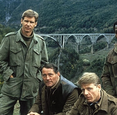 Le film d’Hamilton reprend après le récit des CANONS DE NAVARONE : Après une mission périlleuse sur l’île de Navarone, le major Mallory et le sergent Miller, membres d’un commando des forces américaines, doivent se rendre en Yougoslavie afin d’y éliminer un traître au service des Allemands. Mais l’avion qui les transporte est touché par un obus et contraint à se poser de toute urgence. Les deux hommes sont alors capturés par l’ennemi mais, décidés à mener à bien leur mission, vont tout mettre en œuvre pour s’évader et rejoindre la Résistance. En coulisses, c’est également la guerre, surtout entre Harrison Ford et Guy Hamilton qui ne s’entendent pas du tout. Le premier admettra avoir accepté ce rôle pour l’argent et pour le sortir de la « Han Solo mania ». Le second n’apprécie guère le jeu d’acteur de Ford et menace de le couper au montage s’il ne fait pas mieux. Le studio s’en mêle et calme le jeu : Harrison Ford est désormais une vedette donc un argument commercial pour la sortie du film. L’acteur avouera plus tard avoir vécu là l’un des pires tournages de sa vie…